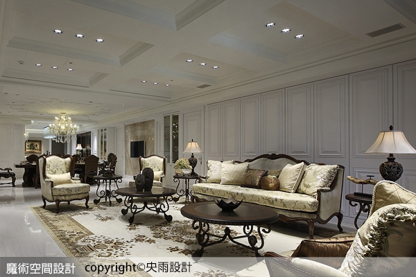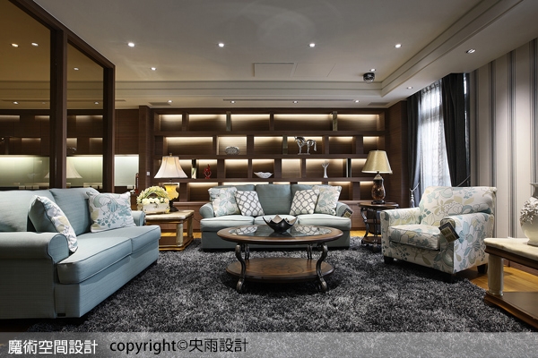 7.【圖說】敞朗的客廳在典雅家具烘托下氣質溫婉,沙發背牆以連續美式新古典門板表現,兼具收納機能。