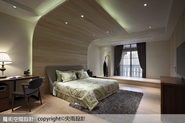 13.【圖說】臥房以木質拼組出流暢弧度,搭配柔和光源,製造獨特的立體視效,也成功修飾掉上方橫樑。