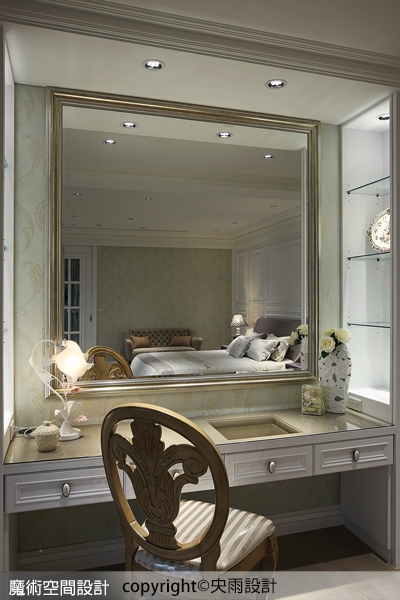 6.主臥床頭立面以美式新古典風格呈現,淡雅色系營造舒眠風情,梳妝鏡側面設計燈櫃,桌面特別留一鑿空抽屜,讓小物一目瞭然。