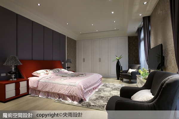 17.【圖說】繃布主牆與朱紅床頭板,跳色搭配出沉穩與能量並重的安定空間感。