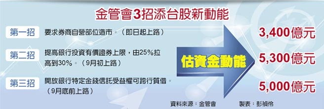 為台股添兆元柴火,金管會20日宣布,證期局已通知券商自營部門履行造市義務,且銀行局將推動銀行特定金錢信託受益權跨行質借,同時提高銀行可投資有價證券的上限,由原先淨值25%提高到30%,三大措施最高可為台股增加近1.4兆元資金動能。