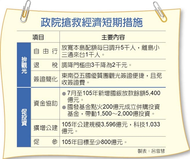 為搶救經濟,行政院昨天宣布多項短期利多,包括陸客來台自由行每日名額調高至5千人,退稅門檻由3千元調降為2千元,簡化東南亞五國簽證,估計至年底可吸引22萬大陸與東南亞旅客,增加107.5億元觀光外匯。