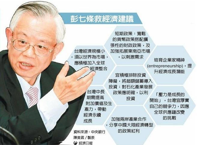 搶救經濟大作戰,中央銀行總裁彭淮南獻策,提出七大建議;其中最受矚目的是,他公開表示將採取寬鬆貨幣政策,來搭配擴張性財政政策,為央行的新政策走向定調。