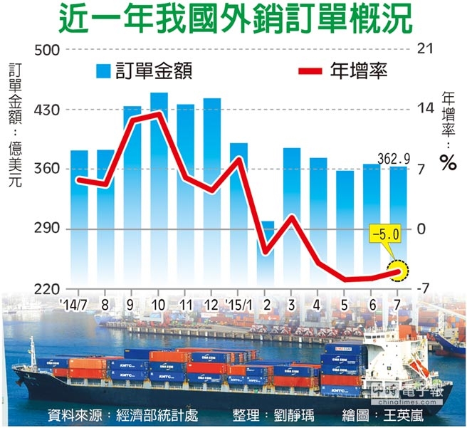 經濟部昨(20)日公布今年7月外銷訂單為362.9億美元,年減5%,已連續四個月負成長,僅剩資通訊一枝獨秀,其餘皆衰退。由於去年下半年接單暢旺,屢創歷史新高,基期頗高,展望年底以前,經部官員說,未來5個月恐將全負成長,甚至擴大為兩位數衰退幅度。