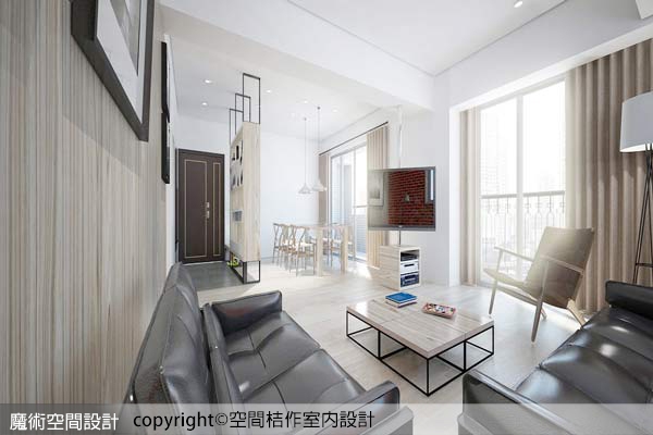 圖說:隱藏門-一只隱藏門虛化了一間位於客餐廳中間的臥室門片,木質的自然紋路揮灑,反而成為一道室內端景。〈3D示意圖〉