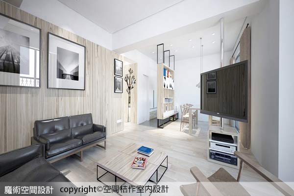 1.68坪的室內空間規劃四房兩廳其實空間相當充裕,所以陳建宏設計師在公領域採開放式,使用旋轉式電視柱讓客餐廳兩邊都能方便共享。