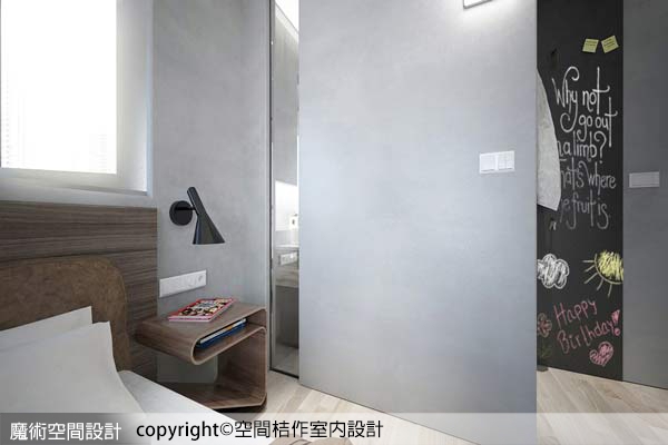 4.臥室灰色的立面襯托起黑板牆塗鴨的多彩繽紛,隨性自由的生活步調,空間愜意舒適。