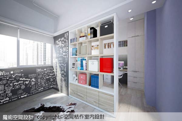 1.穿透式的方格書牆,兼具隔間與收納的功能,串聯起睡眠空間及書房整合性的空間機能。