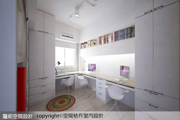 2.書房L型的書桌配置,將書櫃規劃在較高的位子,不影響出入動線,兩邊高櫃將雜物收起,空間簡單清爽。