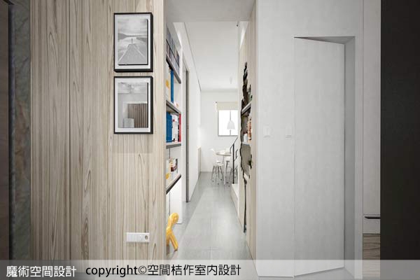 圖說:過渡走道-利用走道兩側作為收納櫃體,簡潔的層板及間照,讓過渡空間也有實用功能,充分發揮坪效。〈3D示意圖〉