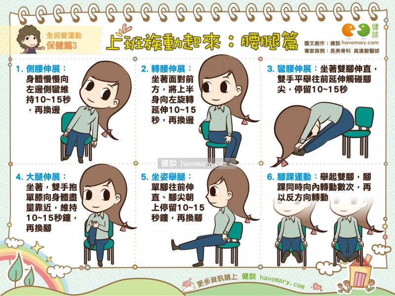 在辦公室裡坐久了,有時會覺得腰酸腿麻的嗎?利用空閒時間動一動,就能改善問題唷!