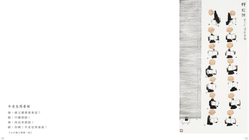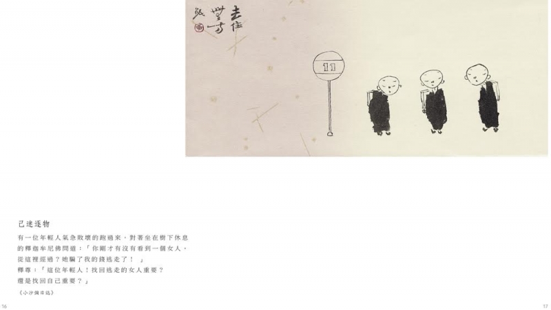 後來我接受《人間福報》的邀請,撰寫純藝術欣賞的專欄,寫了一半之後突發奇想,想要寫點不同的內容,偶然間創作了一個打坐的小沙彌,再搭配佛教的故事,沒想到很受歡迎。我的學生中有佛教徒、基督教徒、伊斯蘭教……大家一見到小沙彌都說「好可愛!好可愛!」它不分宗教、不分國籍,並且不分年齡,老少咸宜,可以說是一個最沒有爭議的角色。自那時候起,藝術欣賞的專欄遂轉為以小沙彌為主角的禪宗公案,每周一篇,也寫了四五年。