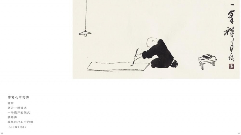 對我來說,「禪」不是宗教,它是一種信仰,一種對使命的堅持,對人生方向的探索。佛教典籍裡經、律、論三藏內涵許多智慧,經過撰寫曉雲法師的禪畫賞析與《人間福報》的藝術欣賞專欄的這十幾年來,我對佛法才逐漸有了更深一層的認識。說起來矛盾,雖然我的個性低調,不喜歡曝光,但對於弘法一事卻願意鞠躬盡瘁。好在拜科技之賜,近年來我開始透過FB,將佛教的經典句子以現代的文字轉化出來,配上稚真的小沙彌,在網路上發表之後,得到很多回響,很多朋友告訴我說,這些小沙彌的貼文,讓他們對生命的認知有一些體悟和改變。至此,總算為弘法找到了一條路,而且現在還一直在進行中。