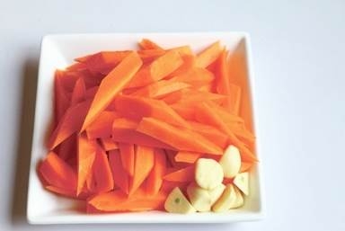 - 胡蘿蔔切成滾刀塊,去皮大蒜一切為二。