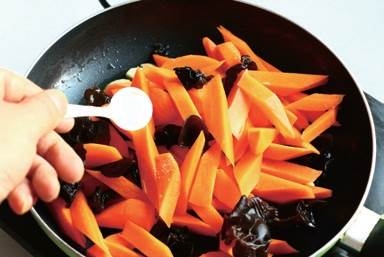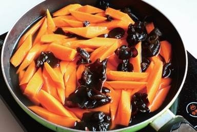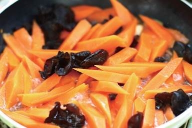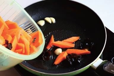 - 炒鍋加少許油燒熱,放入切好的大蒜,小火煸炒至金黃色,然後放入過水的胡蘿蔔塊和木耳。