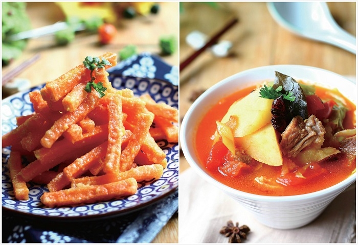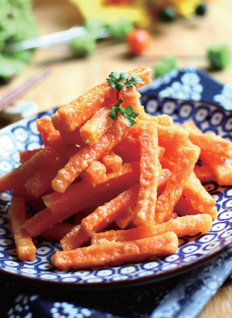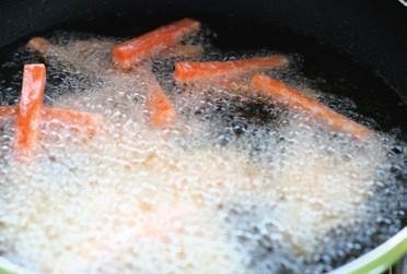 - 鍋裡倒入植物油,油溫約150 度時,放入胡蘿蔔條,炸到表皮酥脆。