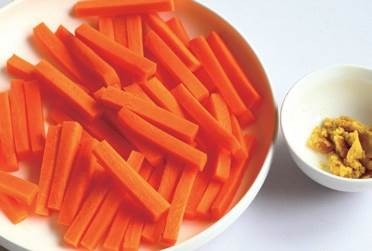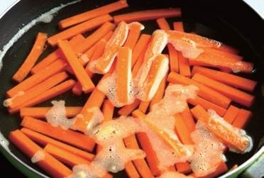 - 鍋裡燒開水,將切好的胡蘿蔔條放入鍋中過水,然後撈出瀝乾水分。