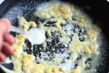 - 鍋中留點底油,開小火,放入蛋黃碎末,炒到起泡沫,加入鹽、糖調味。