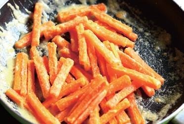 - 倒入炸好的胡蘿蔔條翻炒均勻,盛入盤中即可。