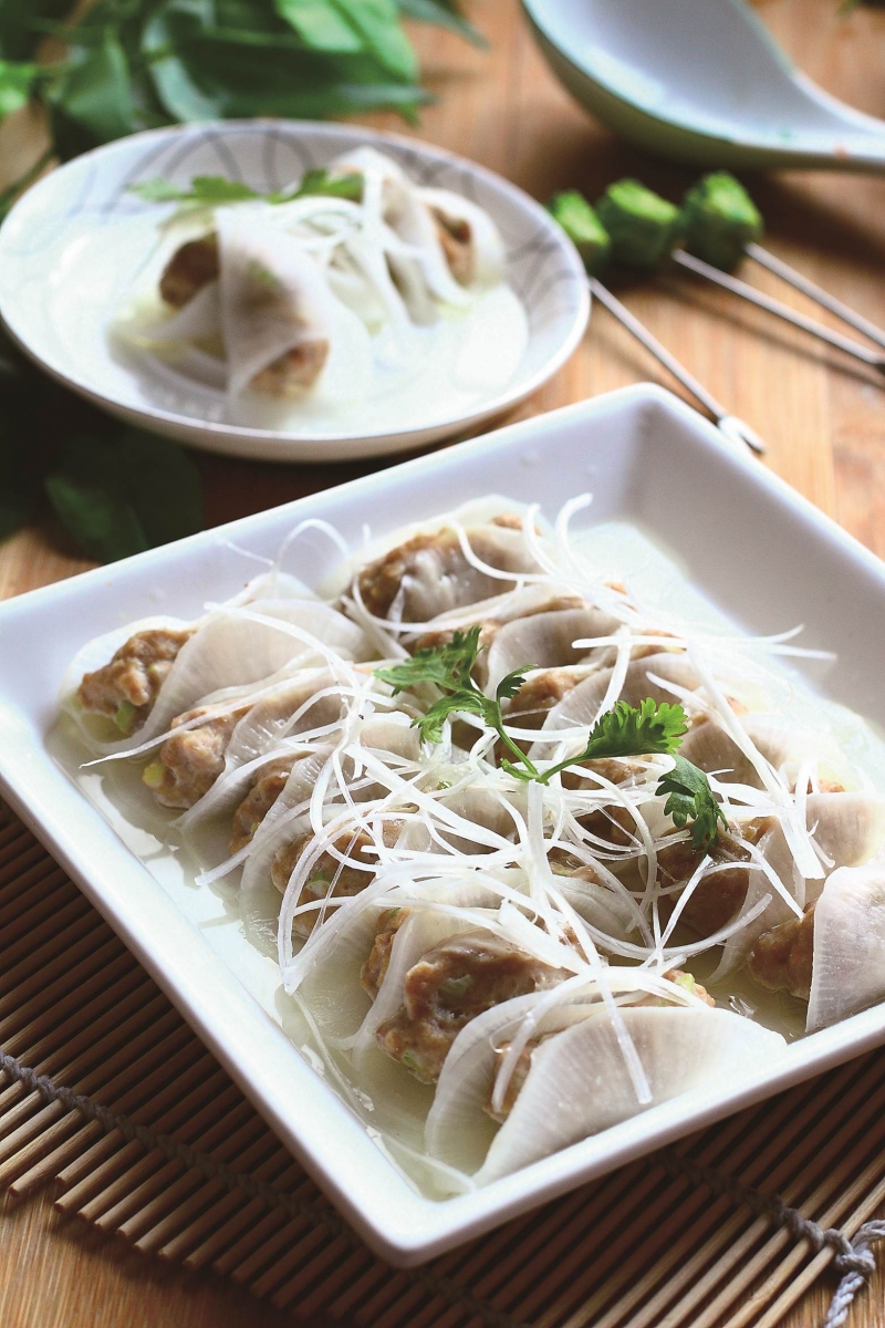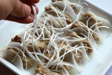 - 將捲好的白蘿蔔肉捲放入蒸鍋裡,蒸6分鐘。時間到取出,撒上切好的蔥絲,淋上熱油,再淋上日式海鮮醬油就可以了。