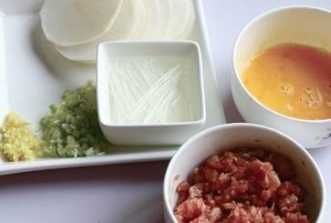 白蘿蔔200克,豬肉餡100克,雞蛋1個,蔥15克,嫩薑10克