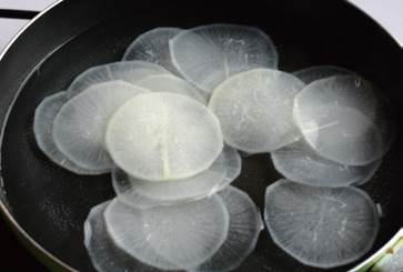 - 湯鍋加水燒開,放入切好的白蘿蔔片,稍微燙一下。