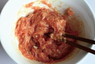 - 豬肉餡加雞蛋、料酒,朝同一個方向攪拌,然後加鹽調味,再放入蔥末和薑末攪拌均勻。