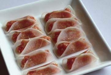 - 將白蘿蔔片鋪在盤中,中間放上一點拌好的肉餡,再將白蘿蔔片兩邊折向中間成捲狀。依同樣方法捲好所有的白蘿蔔肉捲。