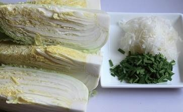 - 將大白菜縱向均分成四份,白蘿蔔削成絲,韭菜切成小段。