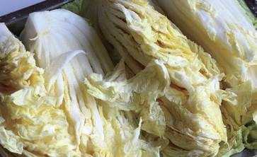 - 切好的大白菜每層都抹上鹽,尤其是白菜梗處,醃上一夜。用水沖去表面的鹽,然後擠乾水分。