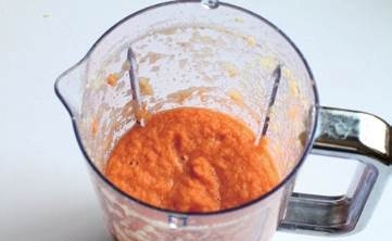 - 蘋果、梨去皮去核,與大蒜、嫩薑、洋蔥、胡蘿蔔一起放入料理機裡打成泥,放到碗裡。