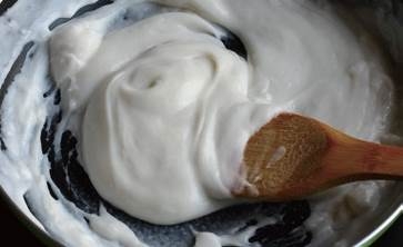 - 糯米粉加500 克水(1:10)拌勻,然後拿到瓦斯爐邊煮邊攪拌至冒泡、黏稠,放涼備用。