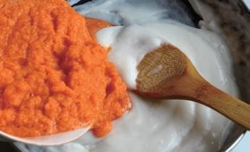 - 把準備好的料泥倒入盛有糯米糊的容器裡。