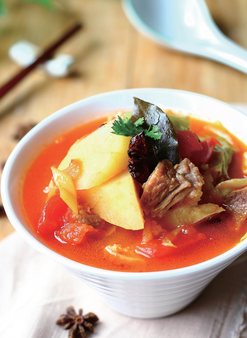 冷冷的天氣,來碗洋蔥、馬鈴薯、高麗菜、番茄和牛腩交織而成的羅宋湯,一口飲入,暖暖的,酸酸的,不僅是暖和了整個胃,整個人會感到陣陣的幸福。