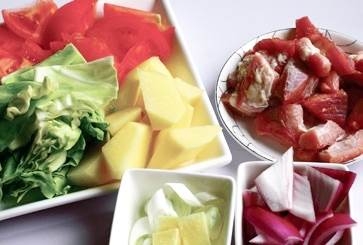 - 高麗菜切成塊,馬鈴薯切成塊,番茄切成小瓣,牛腩切成塊,蔥切成蔥片,嫩薑切成薑片,洋蔥切成塊。