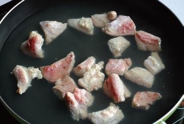 - 湯鍋加水燒開,放入切好的牛腩塊汆燙。