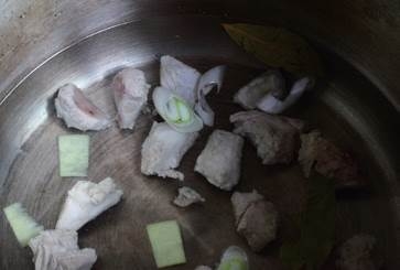 - 瀝乾水分的牛腩放入壓力鍋裡,加一半蔥片和薑片、料酒、1 個八角、香葉,加水壓30分鐘。