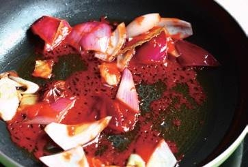 - 炒鍋加少許油燒熱,放入另一個八角炸出香味,放入蔥片和薑片炒香,再放入番茄醬炒一下。