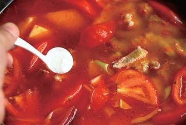 - 倒入壓好的牛腩和湯,加鹽、糖、味極鮮醬油調味。