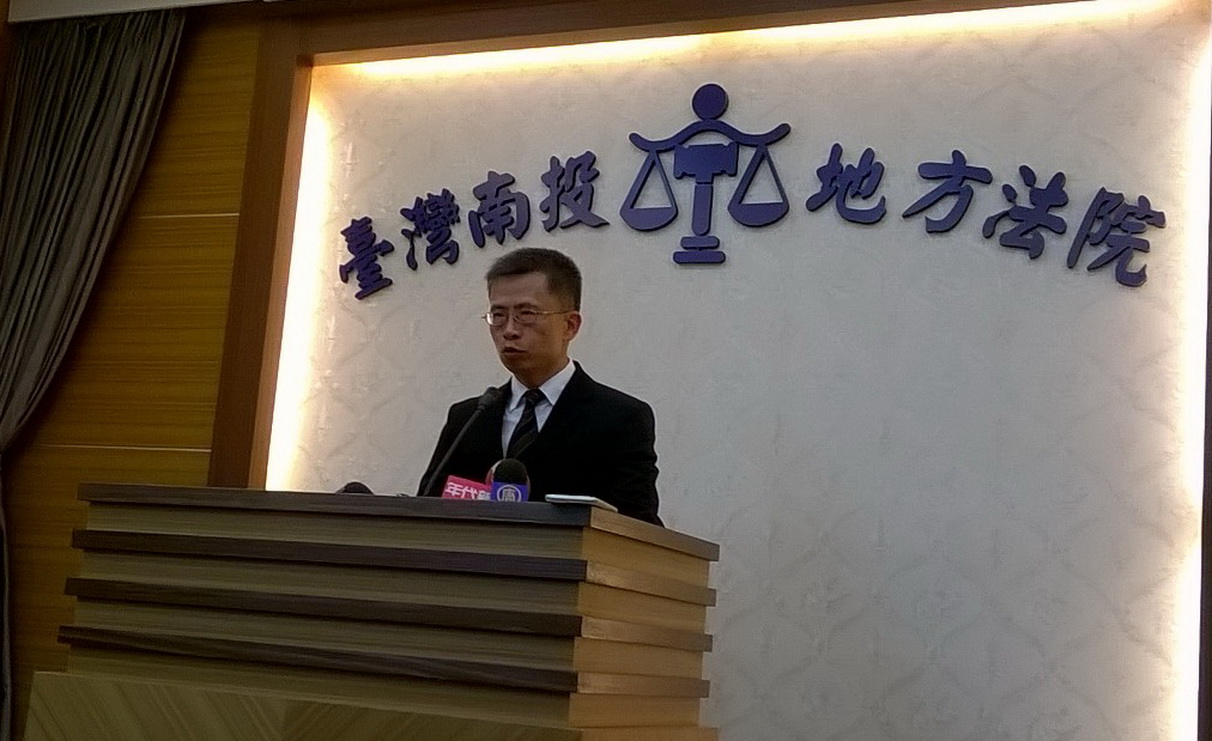 圖說:南投地院刑事庭長林永祥說明合議庭對前南投縣長李朝卿做出30年徒刑的決議。(記者扶小萍攝)