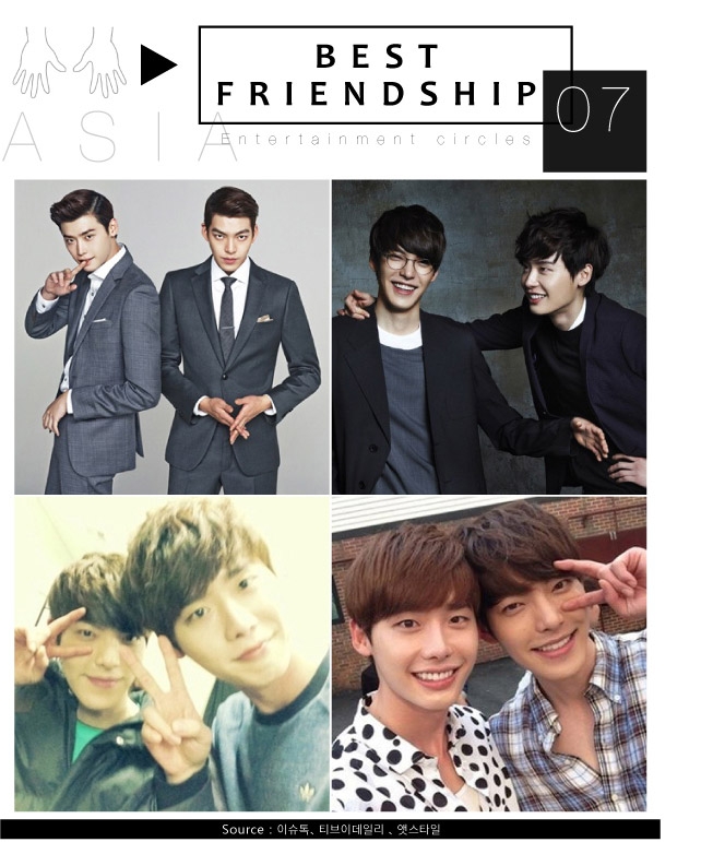 早在模特兒時期便熟識彼此的李鍾碩及金宇彬,相繼轉為演員發展後,更一起演過偶像劇《學校2013》,兩人之間不但沒有火藥味,還是互相扶持的好夥伴。作為當今最火紅的新生代演員,相信他們會一直陪在對方身旁!