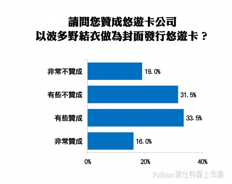 Pollster波仕特線上市調網針對1,771位受訪者詢問「請問您贊成悠遊卡公司以波多野結衣做為封面發行悠遊卡?」,結果顯示以「有些贊成」的受訪者占多數,約為整體受訪者之33.5%;其次為「有些不贊成」,占31.5%;「非常不贊成」則為第三,占19.0%。從結果可得知,對於此事件之贊成度,民眾持贊成意見者(49.5%)與持反對意見者(50.5%)約各占一半。