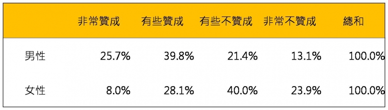 進一步以「性別」為基礎與「發行以波多野結衣為封面的悠遊卡之贊成度」進行交叉分析,結果發現「性別」於「發行AV悠遊卡贊成度」具顯著差異。男性有六成五(65.5%)持「贊成意見」,而女性有六成三(63.9%)持「不贊成意見」(如下表)。此項調查可以明顯看出,女性為性工作者,其「身體被公開展示、消費」這件事情,男性和女性呈現不同的態度。而儘管悠遊卡公司販售波多野結衣卡備受爭議,但根據新聞報導,共三萬張的波多野結衣悠遊卡,於9/1(二)凌晨開放訂購後,四小時內全數售出。此波消費的熱潮,不僅挑戰了社會應該如何看待「女性身體」的各種觀點,也讓各個觀點皆作為兩性平等教育的省思。