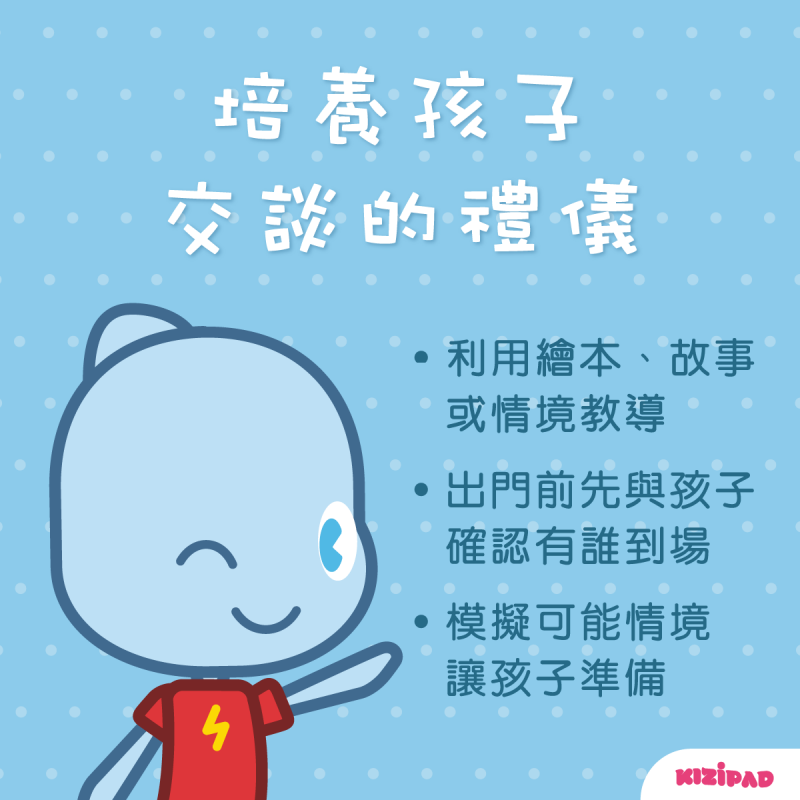 當孩子遇到人,應主動打招呼。就算害羞的孩子,也應該要教他們與他人打招呼、說謝謝、對不起、再見的禮儀。建議家長可以把社會禮儀在家中教導,利用繪本、故事、或是情境,帶領孩子了解交談的禮儀。