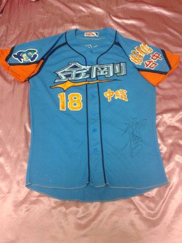 這件令球迷充滿回憶的台灣大聯盟金剛隊實戰球衣,是該年TML年度主題為(英雄出少年)的球衣,貓仔更是當年加盟的中纖金剛隊少年強投,球季結束後也特地 請貓仔在這件陪他渡過職棒新人年的實戰球衣上簽名留念,至今已經收藏了14年多的歲月了,本站將這件球衣分享出來的同時也見證著台灣職業棒球走過兩個聯盟的時代。