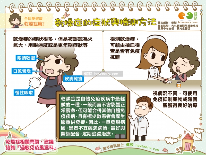 乾燥症是一種自體免疫失調的問題,乾燥症患者會有口乾舌燥、眼睛乾澀、皮膚乾癢、慢性咳嗽、身體酸痛、疲倦等症狀,但很容易被忽略,甚至誤以為是火氣大、用眼過度或是更年期症狀等。