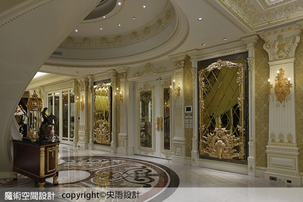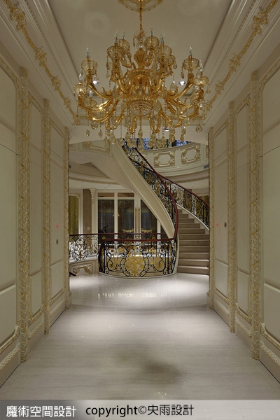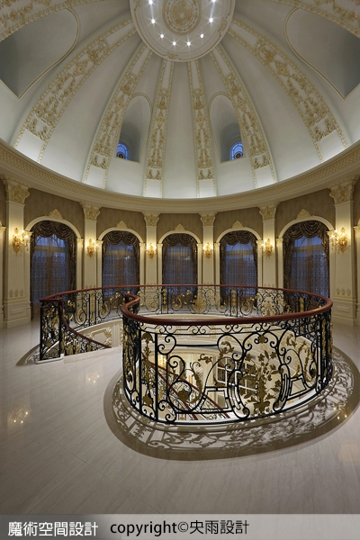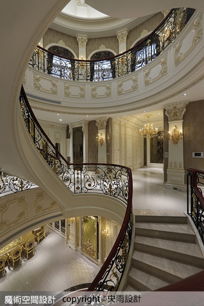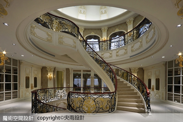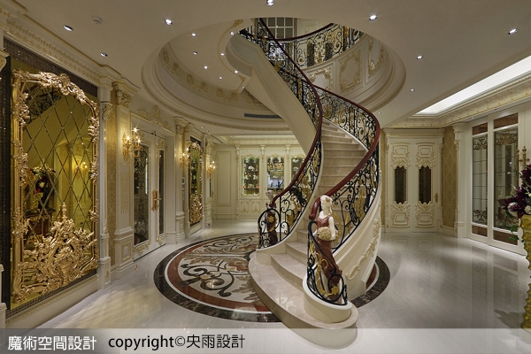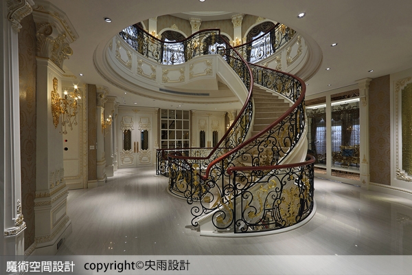 自地自建完整規劃,每樓層200坪共8樓的超豪華別墅案,央雨設計在建築中心大刀闊斧鑿開巨大圓形空間,置入華麗夢幻的螺旋梯,讓屋主實現最愛的歐式宮廷風,也讓來訪賓客們大開眼界。