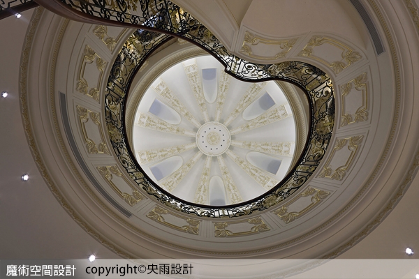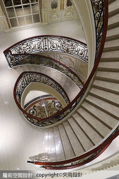 央雨設計以施工難度極高的歐式古典風格旋轉梯為設計重點,雕塑般的視覺震撼及實用機能兼具,樓梯圍欄鍛造花採雙面雙色呈現,強化精緻立體感,由旋轉梯為中心輻射向四面八方的空間,更顯磅礡大器。