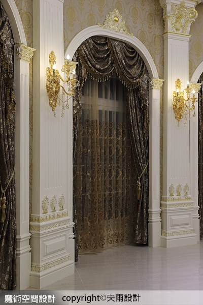 【圖說】歐式古典風格語彙裝飾精緻的列柱之間以連續半圓拱展現窗形,柱頭及壁燈均以對稱及金色語彙描繪。