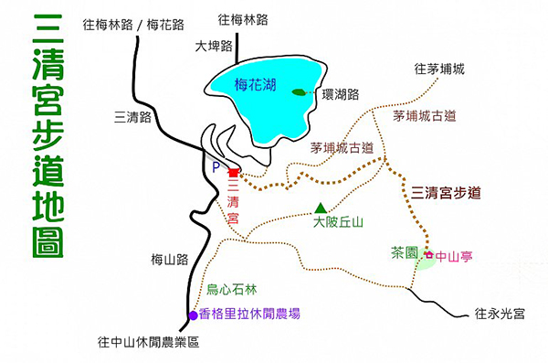 三清宮步道鋪水泥路,環著山腰緩緩上行,通往中山亭,沿途林蔭間,偶爾可以俯瞰梅花湖的一隅。 約行四、五分鐘,左側有小徑岔路, 通往山腳下的茅埔城(得安村),是昔日的茅埔城古道。 茅埔城,又稱「茅埔圍」,是早期來此拓墾的漢人所建立的防禦型聚落。 三清宮步道沿途栽種不少油桐樹,若四、五月來訪,這也是一條賞桐步道。前行約一公里,抵達步道高處的越稜處,左有小土路,循稜而下,可接茅埔城古道。
